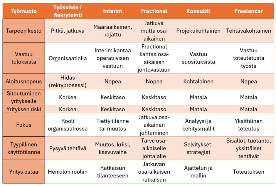 Alla oleva jäsennys auttaa hahmottamaan työmuotojen keskeiset erot yrityksen näkökulmasta.