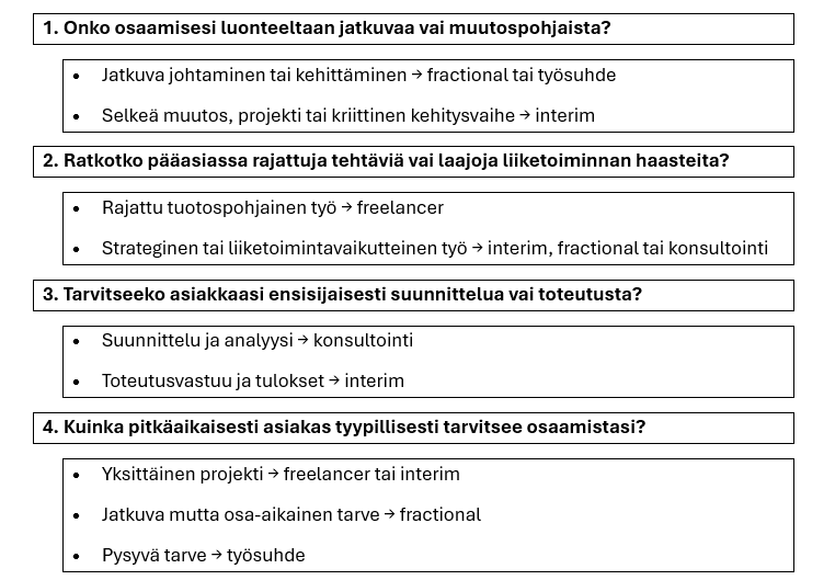 Kun osaamista tarkastellaan yrityksen tarpeen kautta, alkaa nopeasti hahmottua, missä työmuodossa sitä kannattaa tarjota. Jos osaaminen liittyy jatkuvaan johtamiseen tai liiketoiminnan kehittämiseen, fractional voi olla luonteva malli. Jos vahvuus on muutosten läpiviennissä tai projektien johtamisessa, interim sopii usein paremmin. Jos työ on selkeästi tuotospohjaista, freelancer-malli voi olla tehokkain.